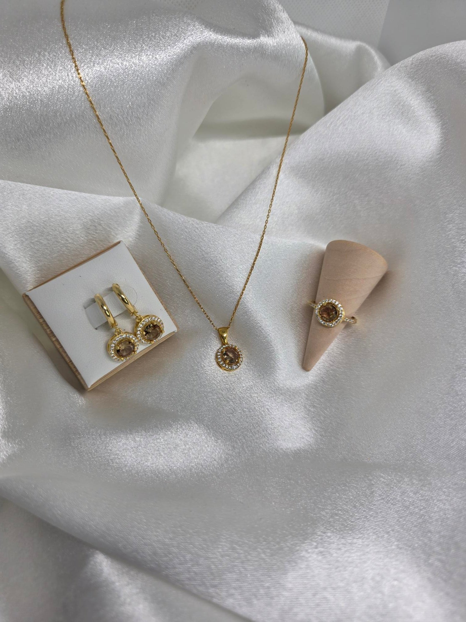 La parure PERLA comprend un collier, une bague et des boucles d'oreilles, tous conçus avec une forme ronde élégante. Chaque bijou met en valeur la pierre Zultanite, reconnue pour ses changements subtils de couleur, enveloppée délicatement de pierres blanches qui accentuent sa lumière. Cette combinaison offre un équilibre parfait entre sophistication et éclat naturel, idéale pour sublimer toute tenue avec raffinement.