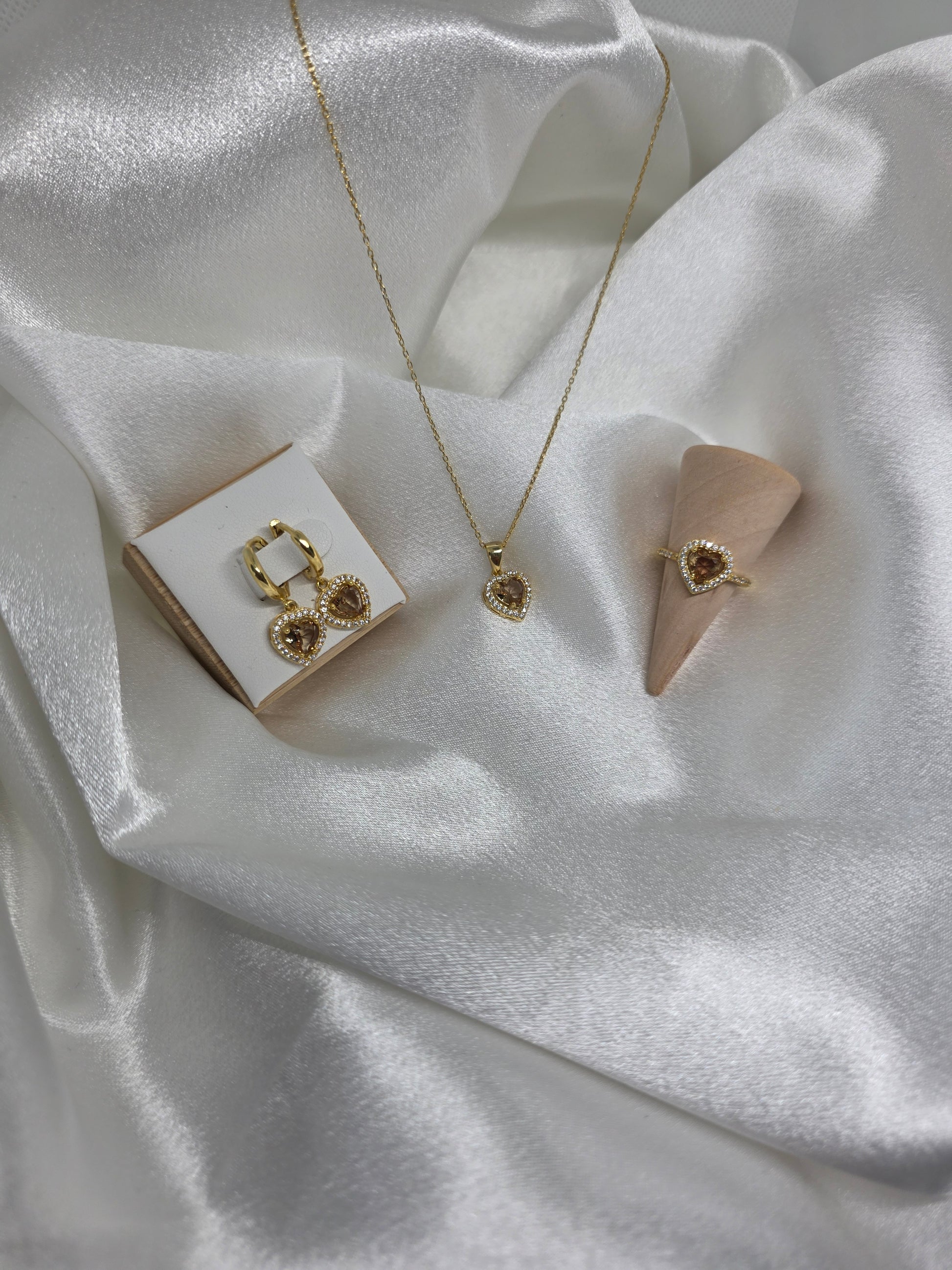 La parure SERAYA réunit un collier, une bague et des boucles d’oreilles conçus en forme de cœur, délicatement ornés de petites pierres blanches. Au centre de chaque pièce, une pierre Zultanite synthétique apporte une touche d’éclat unique grâce à ses reflets changeants. Cette composition allie finesse et sophistication, idéale pour sublimer élégamment toutes vos tenues.